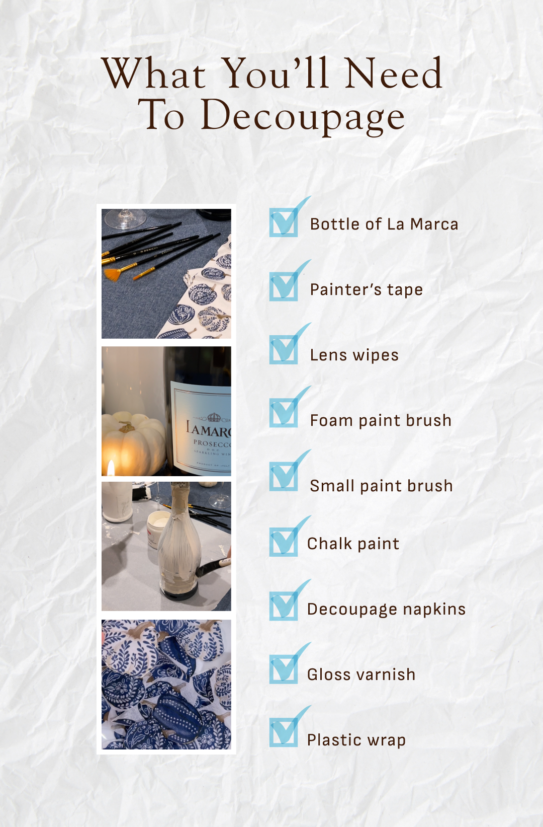 The Fall holidays are upon us. The question is, what are you bringing to the table? You love the bubbly brilliance inside every bottle of La Marca Prosecco, but did you know the bottle itself can be a beautifully crafted canvas? Whether you're hosting a Halloween soirée, attending a Friendsgiving, or searching for an elegant Thanksgiving table décor, a beautifully decoupaged bottle of La Marca is the perfect touch for all your fall celebrations.